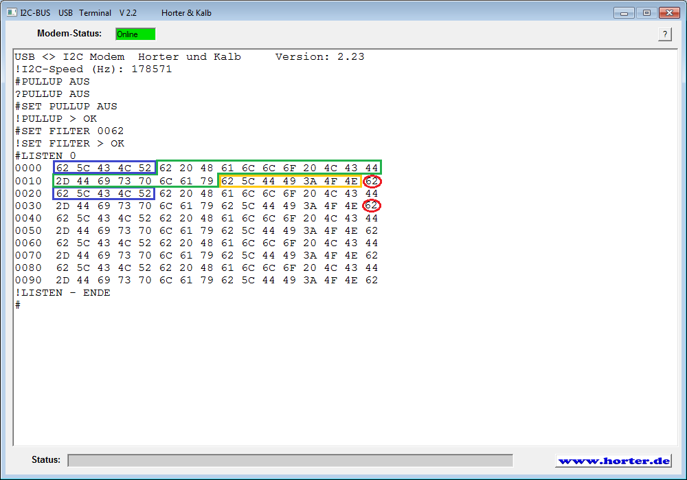 Im Datenlogger-Fenster vom I2C-USB-Modem sieht man die einzelnen Befehle: