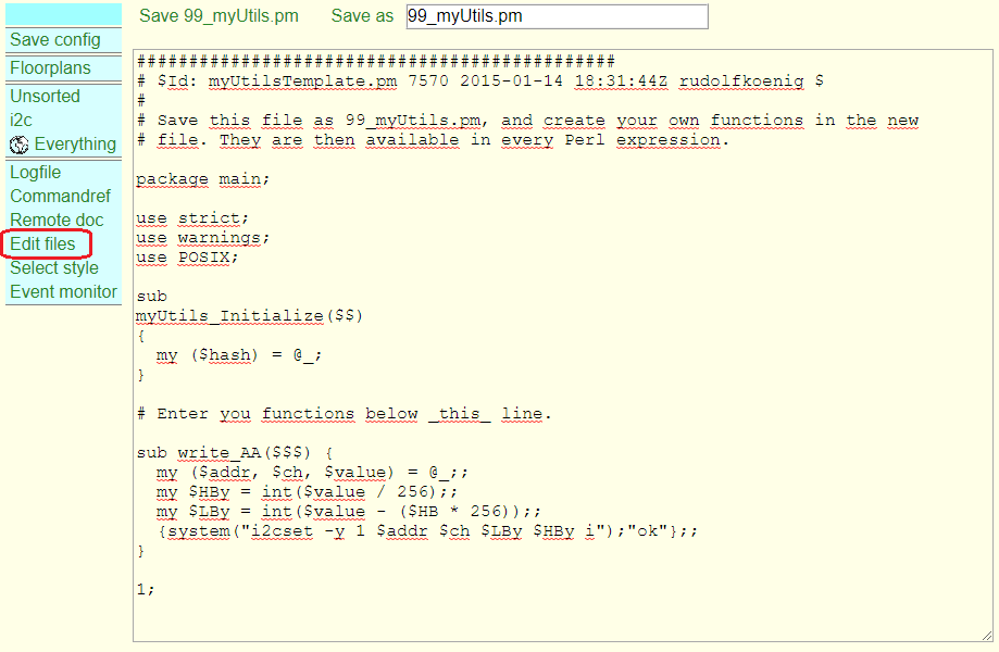 über den Menüpunkt „Edit Files“ kommt man in das FHEM-Filesystem. Hier das Template „myUtilsTemplate.pm“ anklicken und als neue Datei „99_myUtils.pm“ speichern. In diese Datei unter der Zeile „# Enter you functions below _this_ line.“ können nun eigene Funktionen abgelegt werden.