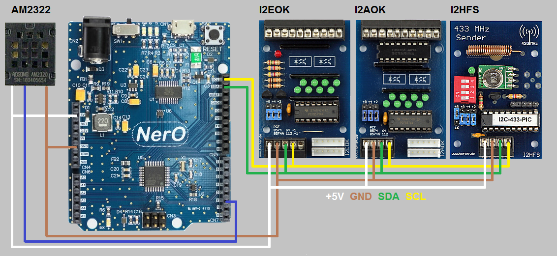 Die I2C-Pins sind beim NerO Pin1 = SCL und Pin2 = SDA. +5V und GND sind auf der linken Leiste vorhanden.