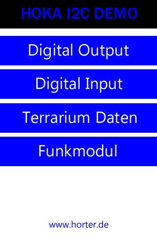 //Variablen für Touchlogik bool penDownOn20 = false, penDownOn21 = false, penDownOn22 = false, penDownOn23 = false; bool butADwn=false, butBDwn=false; void display_start() { CleO.Start(); int tiefeBt1 = 100; int tiefeBt2 = tiefeBt1+75; int tiefeBt3 = tiefeBt2+75; int tiefeBt4 = tiefeBt3+75; //int tiefeBt5 = tiefeBt4+75; //int tiefeBt6 = tiefeBt5+75; CleO.StringExt(FONT_MEDIUM, 160, 0, BLUE, TM, 0, 0, "HOKA I2C DEMO"); CleO.RectangleExt(0, 50, 350, 500, WHITE, TL, 0, 0); CleO.LineWidth(30); if (penDownOn20) { penDownOn20 = false; globalCurrSite = 1; } else if (penDownOn21) { penDownOn21 = false; globalCurrSite = 2; } else if (penDownOn22) { penDownOn22 = false; globalCurrSite = 3; } else if (penDownOn23) { penDownOn23 = false; globalCurrSite = 4; } CleO.Tag(20); CleO.LineColor(BLUE); CleO.Line(0, tiefeBt1, 350, tiefeBt1); CleO.StringExt(FONT_MEDIUM, 160, tiefeBt1, WHITE, MM, 0, 0, "Digital Output"); CleO.Tag(21); CleO.LineColor(BLUE); CleO.Line(0, tiefeBt2, 350, tiefeBt2); CleO.StringExt(FONT_MEDIUM, 160, tiefeBt2, WHITE, MM, 0, 0, "Digital Input"); CleO.Tag(22); CleO.LineColor(BLUE); CleO.Line(0, tiefeBt3, 350, tiefeBt3); CleO.StringExt(FONT_MEDIUM, 160, tiefeBt3, WHITE, MM, 0, 0, "Terrarium Daten"); CleO.Tag(23); CleO.LineColor(BLUE); CleO.Line(0, tiefeBt4, 350, tiefeBt4); CleO.StringExt(FONT_MEDIUM, 160, tiefeBt4, WHITE, MM, 0, 0, "Funkmodul"); CleO.StringExt(FONT_SANS_2, 160, 440, BLUE, TM, 0, 0, "www.horter.de"); CleO.Show(); } void control_start() { int16_t x, y, dur, tag; CleO.TouchCoordinates(x, y, dur, tag); //Tag des Beruehrungspunktes einlesen if (previousDur == 0 && dur != 0) //Wenn previousDur == 0 -> beruehrung aktiv und Dauer der Beruehrung nicht 0 { previousTag = tag; //Tag zwischenspeichern previousDur = 1; //Setze previousDur = 1 fuer "wurde gedrueckt" if (tag == 20) //Button-Tag herausfinden penDownOn20 = true; //entsprechende bool-Variable schalten (Weitere Verarbeitung in "display_do()") else if (tag == 21) penDownOn21 = true; else if (tag == 22) penDownOn22 = true; else if (tag == 23) penDownOn23 = true; } else if (previousDur == 1 && dur == 0) { previousDur = 0; if (previousTag == 20) penDownOn20 = false; else if (previousTag == 21) penDownOn21 = false; else if (previousTag == 22) penDownOn22 = false; else if (previousTag == 23) penDownOn23 = false; } }