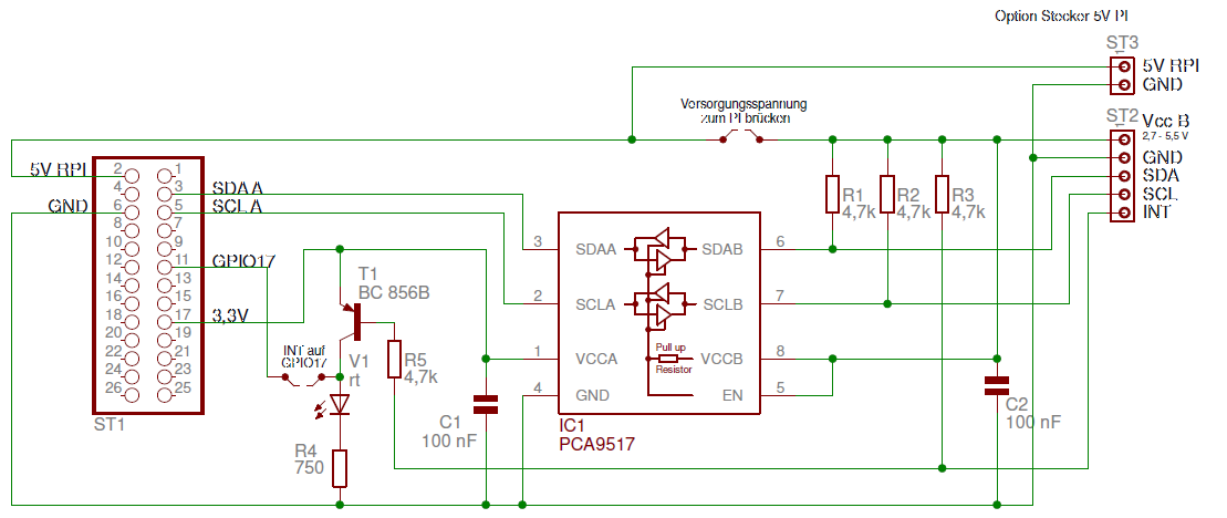 Dadurch erhalten Sie zwar keine richtige galvanische Trennung zwischen der Versorgungsspannung des Raspberry PI und der I2C-Peripherie Aber es ist zumindest ein Bauteil dazwischen, welches die empfindlichen GPIO-Pins vor höheren Spannungen schützt.