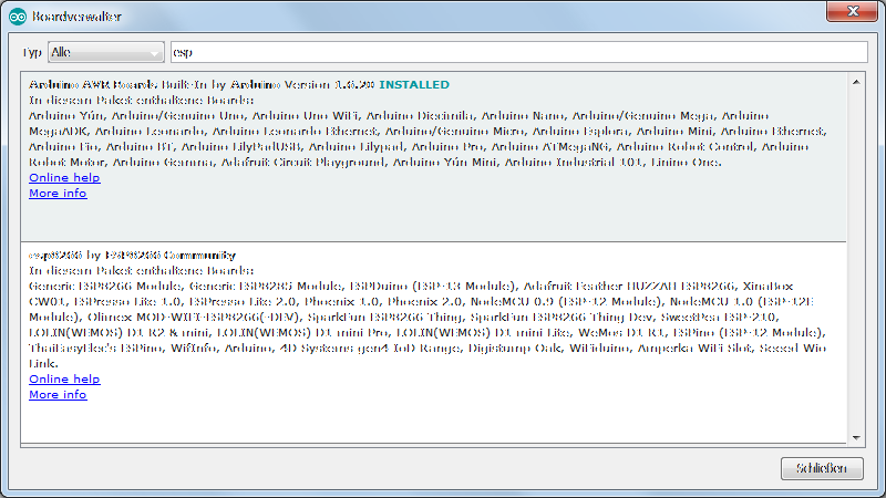 Anschließend über „Werkzeuge“ > „Board“ > „Bordverwalter“ die Board-Bibliothek „esp8266 by ESP8266 Community“ nachinstallieren
