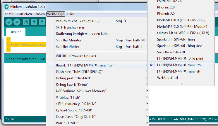 Jetzt kann das Board „LOLIN(WEMOS) D1 mini Pro“ ausgewählt und konfiguriert werden. (Siehe Screenshot)