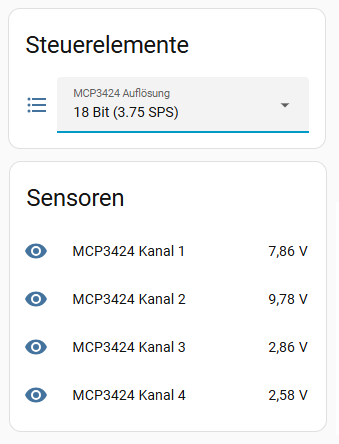 Am Ende des Beitrags steht eine vollständige YAML-Datei zum Download sowie ein Beispiel, wie die Auflösung des MCP3424 eingestellt und die Messwerte in Home Assistant dargestellt werden.