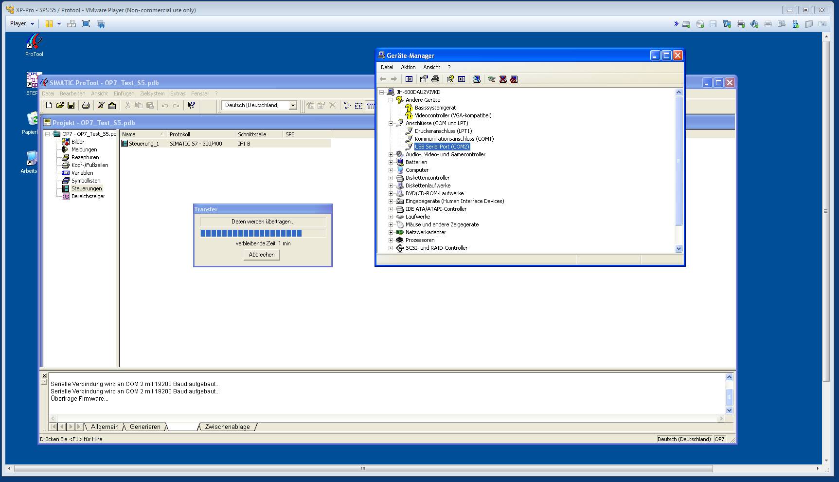 Rechte Maustaste auf den COM Port – Eigenschaften – Anschlusseinstellungen – Taste Erweitert – COM Anschlussnummer (Bild siehe unten). - Protool starten und Transfereinstellungen COM2 38400 Baud einstellen