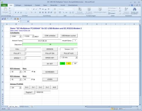 I2C-USB+M2-Multiplexer-Test.zip (133 kB) Excel-Makro mit einem Beispiel zur Ansteuerung der Kanalauswahl des I2C-Multiplexer PCA9544A für das I2C-USB-Modem oder das I2C-RS232-Modem 2 |