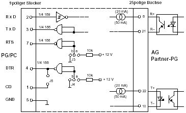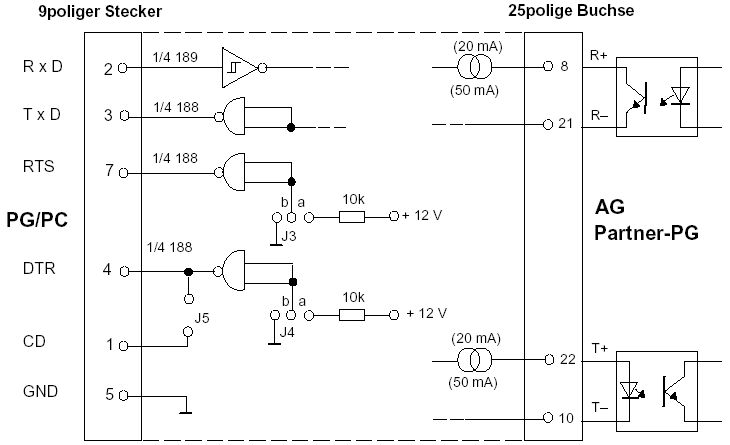 Bei der SIEMENS Kösterbox kann der Linienstrom auf 20 mA oder 50 mA "umgejumpert" werden. Anscheinend gab oder gibt es irgendwelche Steuerungen oder Drucker, die mit diesem hohen Linienstrom arbeiten. Diese Möglichkeit besteht bei unserem Wandler auch um eine Kompatibilität zum SIEMENS-Wandler herzustellen.
